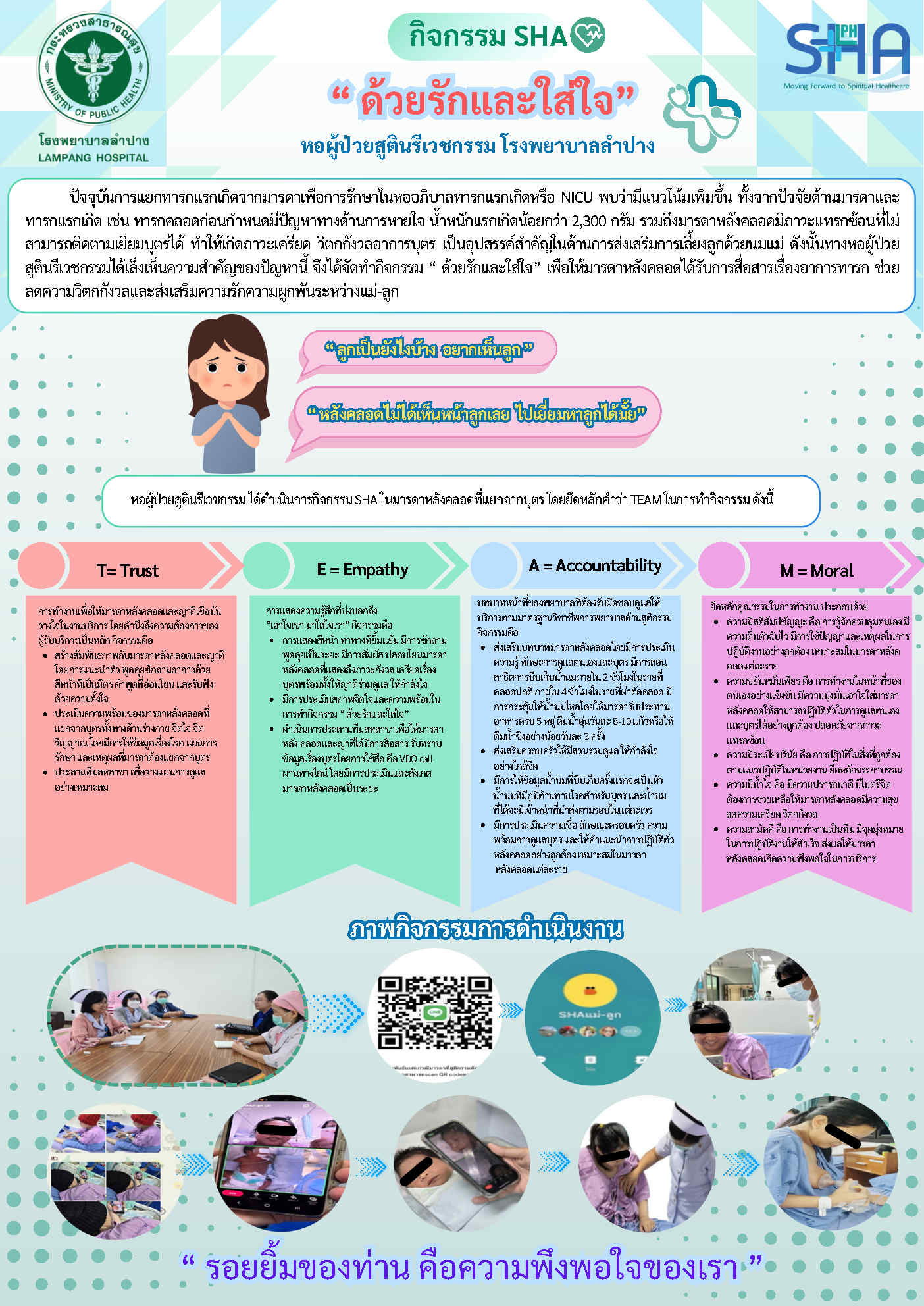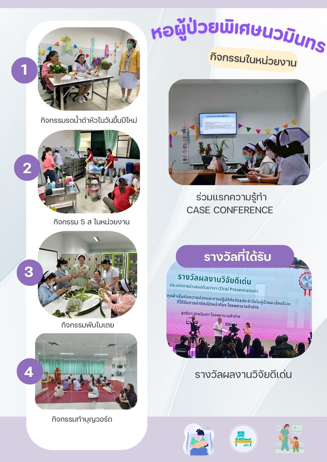 วัดผลความพึงพอใจของผู้ป่วยหนักที่ได้รับการดูแลจากบุคลากรทางการพยาบาลในแต่ละวอร์ด โดยประเมินจากแบบสอบถามความพึงพอใจ ซึ่งมีระดับคะแนน 1-5 โดยระดับ 4-5 ถือว่าเป็นระดับดีถึงดีมาก