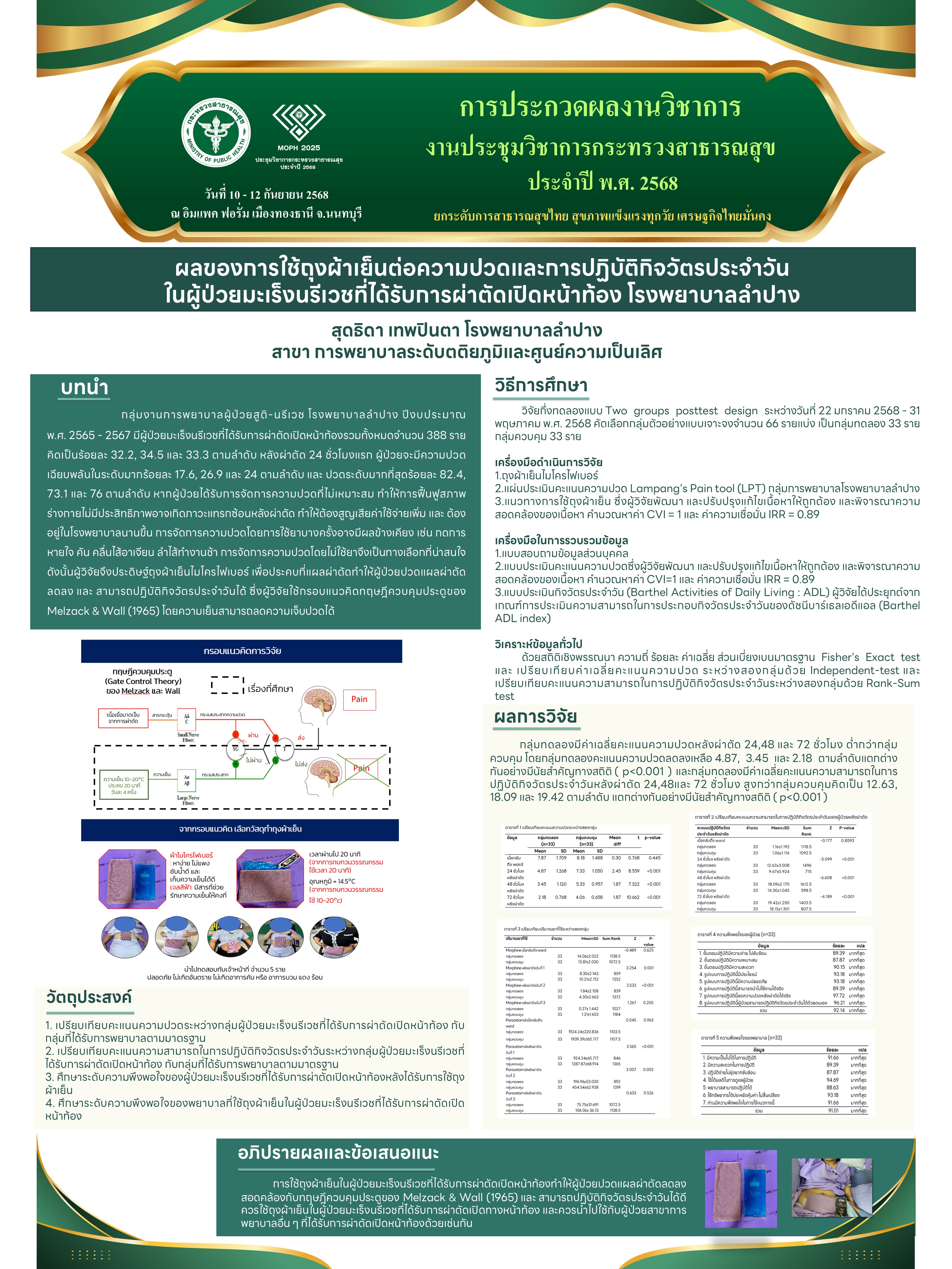 ร้อยละของคะแนนความพึงพอใจ = (จำนวนผู้ป่วยที่ประเมินความพึงพอใจระดับดีถึงดีมาก / จำนวนผู้ป่วยที่ตอบแบบประเมินทั้งหมด) × 100