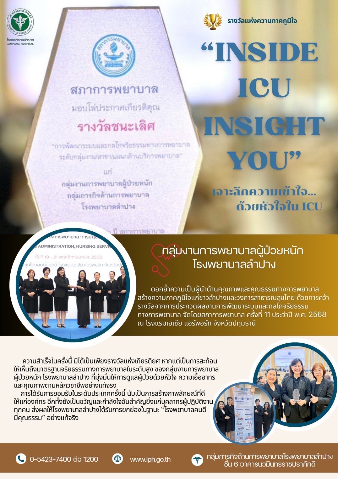 ขอแสดงความยินดี กลุ่มงานการพยาบาลผู้ป่วยหนัก โรงพยาบาลลำปางได้รับการคัดเลือกให้ไปนำเสนอผลงาน HA Forum ครั้งที่ 25 ประจำปี 2568 ประเภท "ผลงานการพัฒนาคุณภาพ" เรื่อง เสียงแห่งความห่วงใย สร้างสายใยแห่งความเชื่อมั่น voice of care